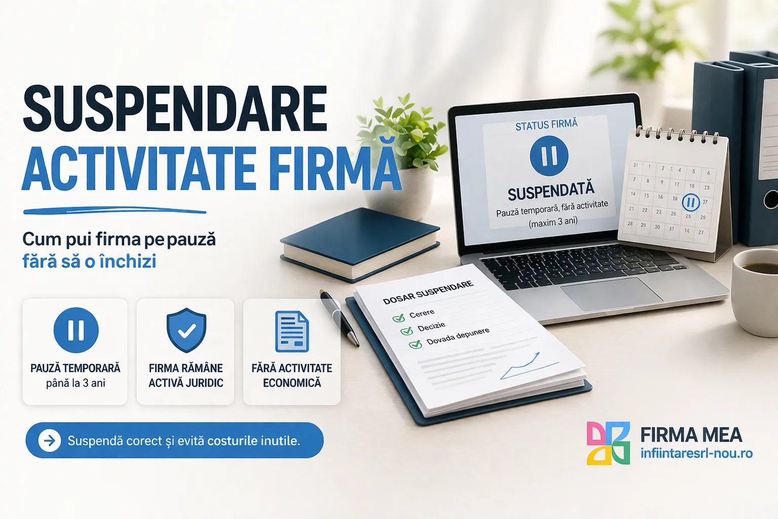 Poți suspenda temporar activitatea firmei atunci când nu o mai desfășori și când nu dorești să închizi firma. Oricând poți