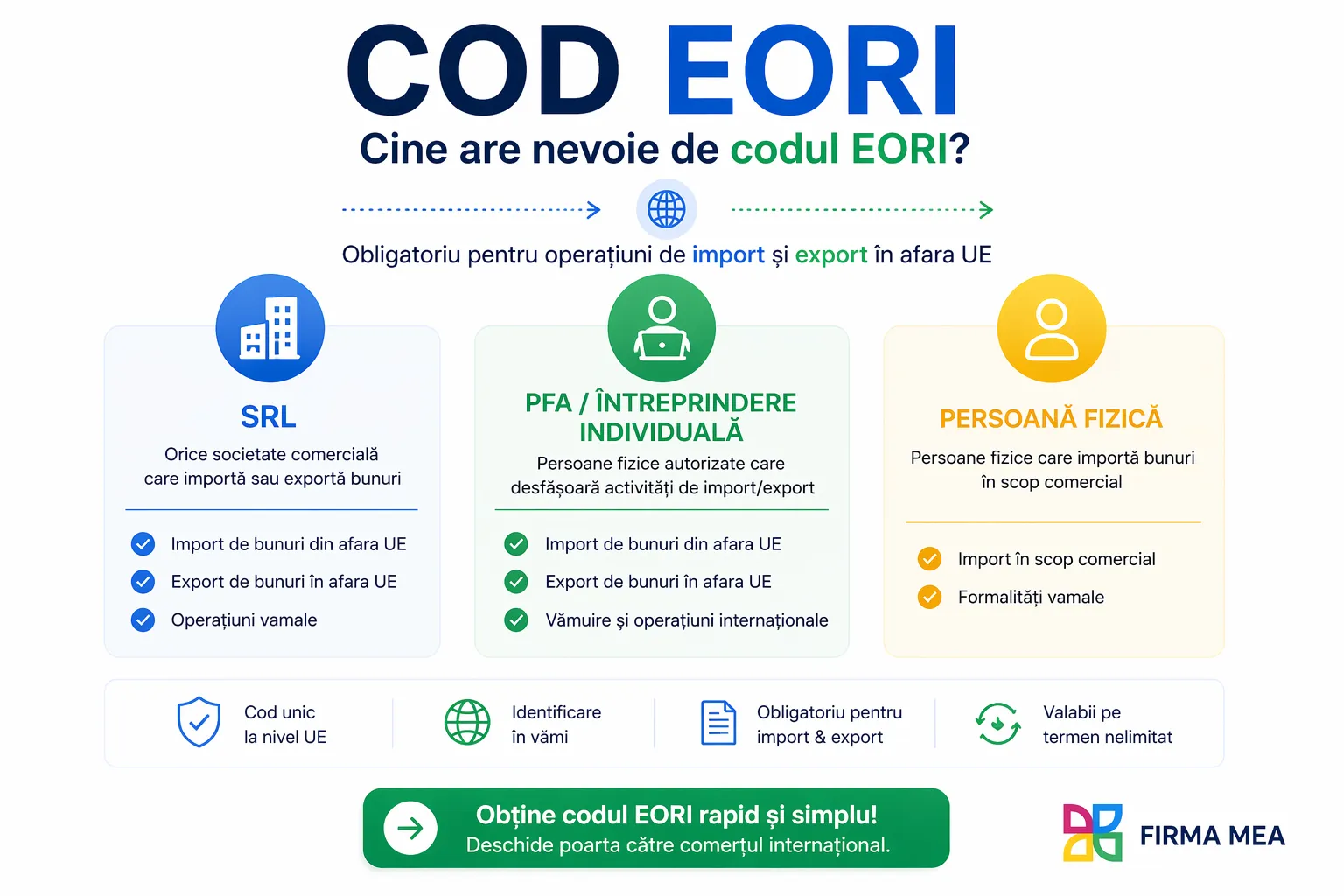 Codul EORI trebuie obținut de către toți operatorii economici (firmele) din Uniunea Europeană, dar și de cei din afara UE,