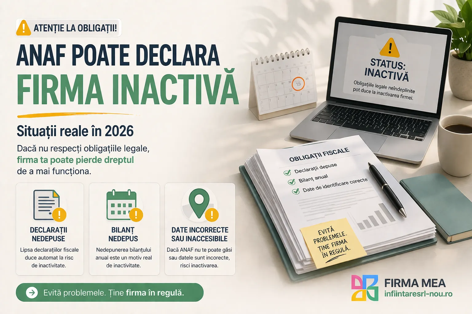 Există două noi situații în care ANAF poate declara firma inactivă în 2026, și acestea sunt: societatea nu are un