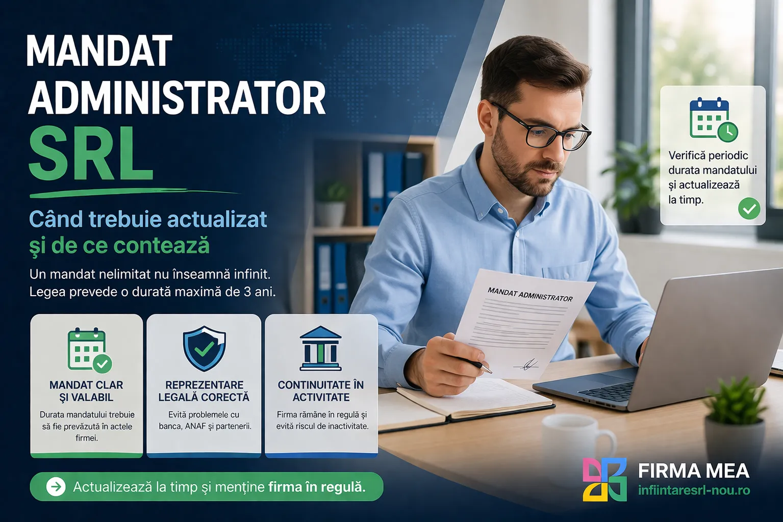 Dacă în actul constitutiv al SRL-ului scrie că administratorul este numit pe durată nelimitată sau nedeterminată, trebuie să știi că
